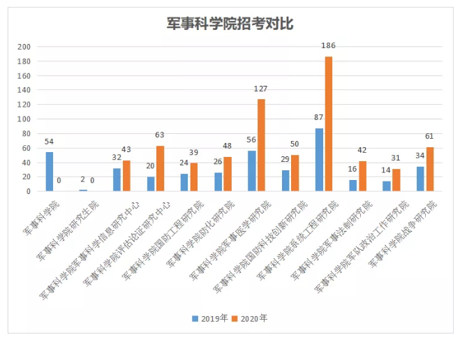 下圖為2019年和2020年軍事科學(xué)院各機構(gòu)招錄人數(shù)對比數(shù)據(jù):